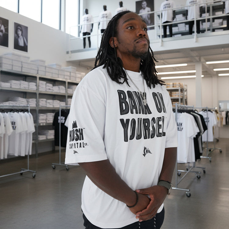 On the back, the tee carries a powerful message: “Bank on Yourself” and “Secure the Legacy.” It’s more than just apparel, it’s a reminder to invest in your vision, trust your grind, and leave your mark.
